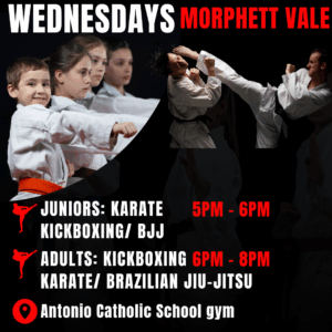 As a mixed martial arts club training includes Karate, Jujitsu, Brazilian Jiu-Jitsu, Kick Boxing and Self-Defence.
